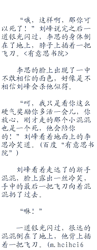 “哦!”刘峰听见王二的话脸上浮现一丝微笑,随后手中的飞刀甩了出去,瞬间插入了王二的喉咙之中。