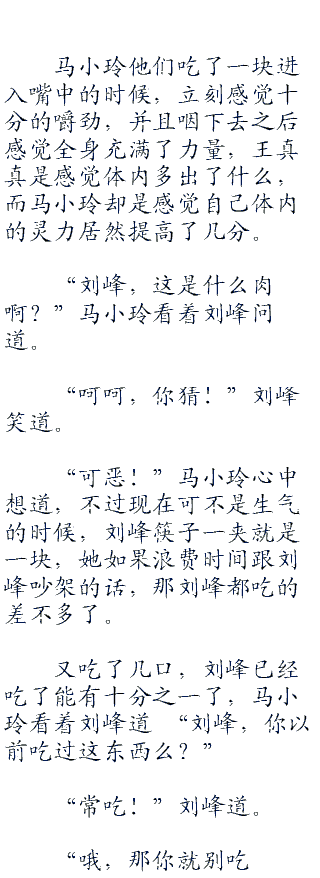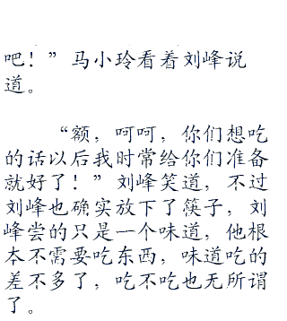 刘峰吃了两口就不吃了,反倒是马小玲津津有味的吃着,王真真看见刘峰放下筷子问道 “怎么不吃了啊?”