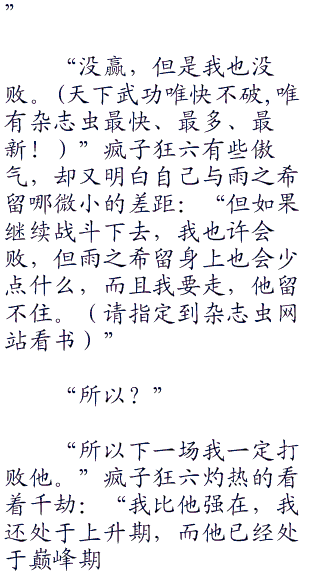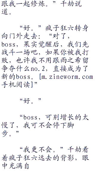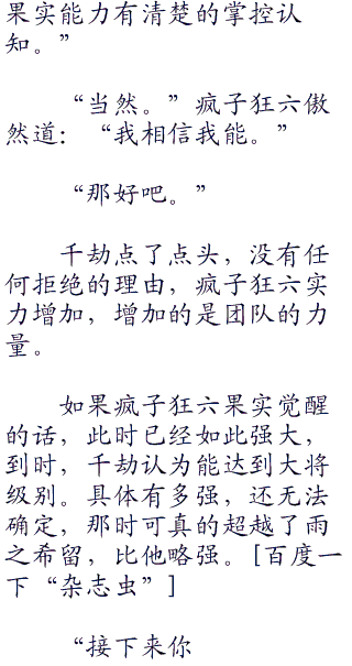 出了一身汗的疯子狂六走进来,刚才他还真与雨之希留战斗了一场。
