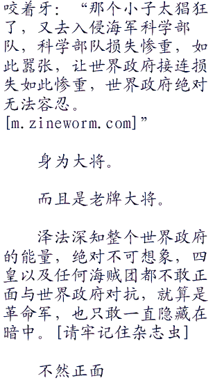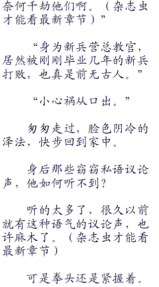 “新兵们都看见了,泽法大将被打得很惨,此事之后,总部还不准新兵乱说,而且泽法这段时间都没有去新兵营上课。”