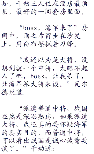 战国无奈的说上善意的谎言:“泽法,不要冲动此时虽然迫于五老星不得如此散发消息,但是你想一想,千劫他会同意成为王下七武海吗?如果不同意,难道我们还能逼着他同意?如果他选择拒绝的话,世界政府肯定会不惜一切代价围剿他的。”