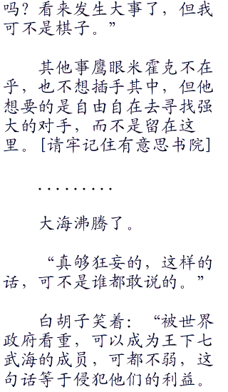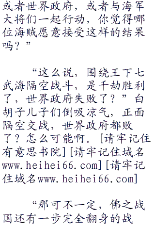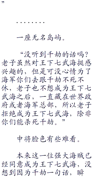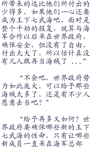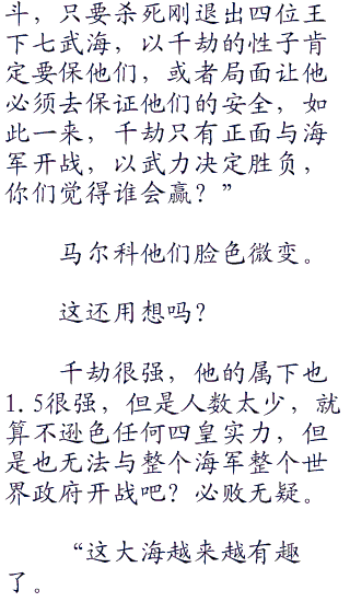 “你白痴啊,就算如此,世界政府为了面子也会尽快布满空缺,到时王下七武海不会因为各人的死去“七五零”与退出就会消失,就算现在只剩下一位,其余六位海军也可以从新赐予别的海贼。”