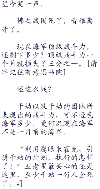 佛之战国战死,海军总部遭遇严重破坏,战役失败,重重打击,给予海军士气很大的打击,新一届海军元帅赤犬继任还没能给海军注入半点士气,那还未曾升起的斗志火焰就被青稚离开的消息完全浇灭。