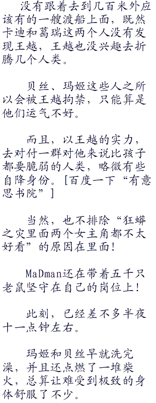 没有跟着去到几百米外应该有的一艘渡船上面,既然卡迪和葛瑞这两个人没有发现王越,王越也没兴趣去折腾几个人类。