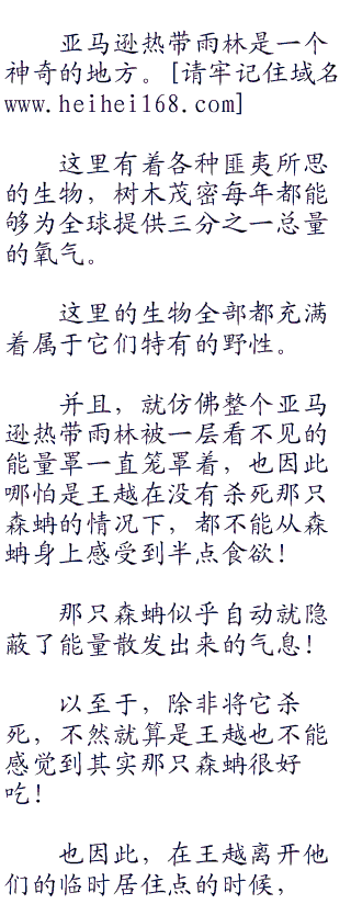 并且,就仿佛整个亚马逊热带雨林被一层看不见的能量罩一直笼罩着,也因此哪怕是王越在没有杀死那只森蚺的情况下,都不能从森蚺身上感受到半点食欲!