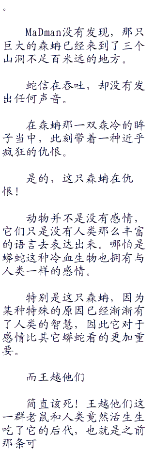 madman没有发现,那只巨大的森蚺已经来到了三个山洞不足百米远的地方。