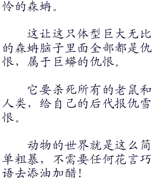 另外,说一下:非我族类,虽远必诛。老鼠和人类是两个不同的种族,不可能和平相处的,当然,在有一种情况下会团结作战……那就是其他星球的生物侵略地球