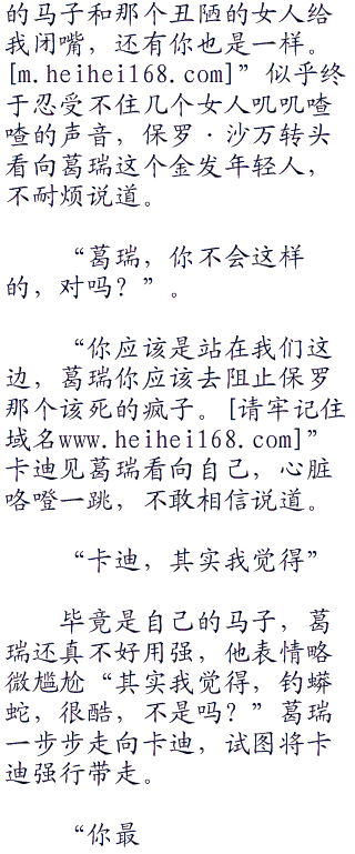 “葛瑞,让你的马子和那个丑陋的女人给我闭嘴,还有你……也是一样。”似乎终于忍受不住几个女人叽叽喳喳的声音,保罗·沙万转头看向葛瑞这个金发年轻人,不耐烦说道。