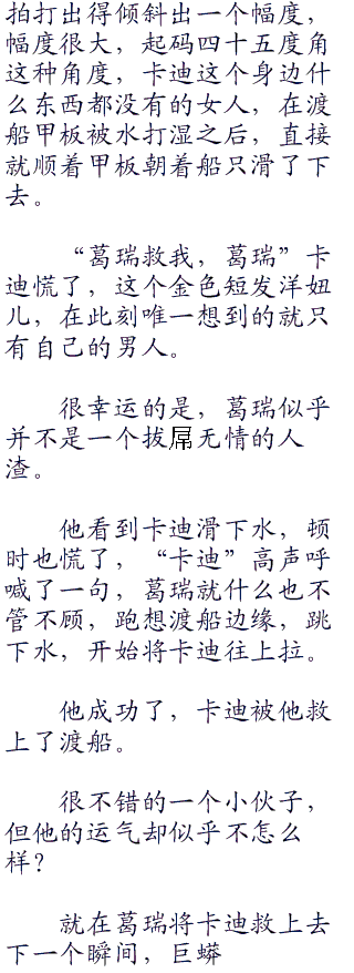 渡船被森蚺巨蟒拍打出得倾斜出一个幅度,幅度很大,起码四十五度角……这种角度,卡迪这个身边什么东西都没有的女人,在渡船甲板被水打湿之后,直接就顺着甲板朝着船只滑了下去。