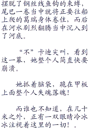 就在葛瑞将卡迪救上去下一个瞬间,巨蟒摆脱了钢丝线鱼钩的束缚,尾巴一卷当中……就将正要往船上爬的葛瑞身体卷住,而后……在河水剧烈翻腾当中沉入到了河底。