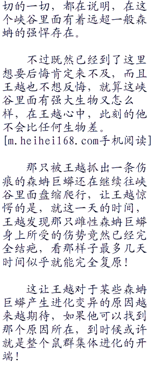 那只被王越抓出一条伤痕的森蚺巨蟒还在继续往峡谷里面盘缩爬行,让王越惊愕的是,就这一天的时间,王越发现……那只雌性森蚺巨蟒身上所受的伤势竟然已经完全结疤,看那样子最多几天时间似乎就能完全复原!