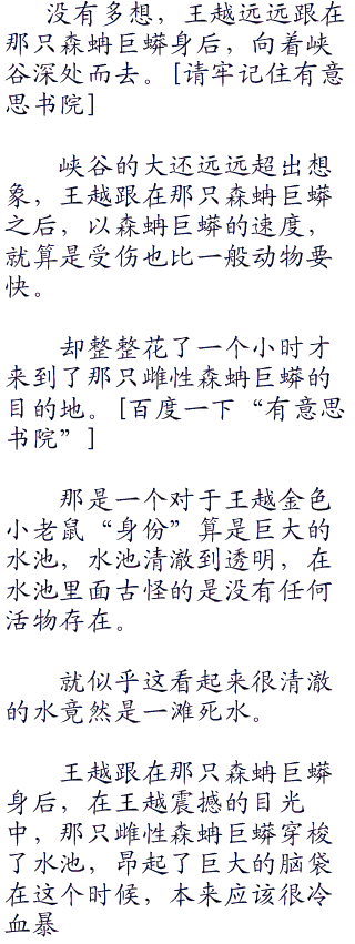 峡谷的大还远远超出想象,王越跟在那只森蚺巨蟒之后,以森蚺巨蟒的速度,就算是受伤也比一般动物要快。