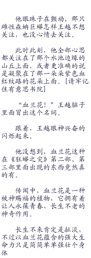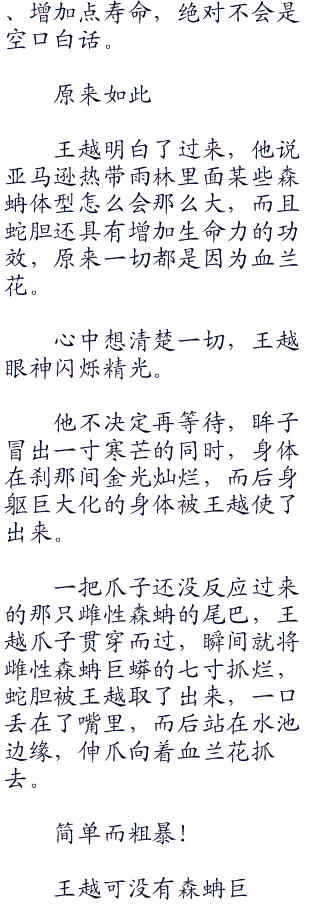 王越明白了过来,他说亚马逊热带雨林里面某些森蚺体型怎么会那么大,而且蛇胆还具有增加生命力的功效,原来一切都是因为血兰花。