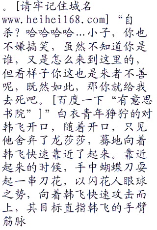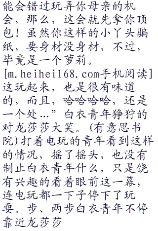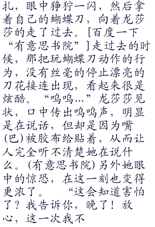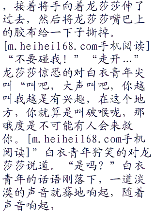 346章叫破喉咙也没用龙莎莎两手都被绳子给束缚在了身后,另外,嘴巴还被胶布给贴着,让她完全不能说出什么完整的话来,当她听到了白衣青年的话语的时候,她的眼中下意识的流露出了惊恐。惊恐的同时,还有着担心。她担心自己的妈妈。虽然她才十一二岁,可却是已经很懂事了。于是下意识的就挣扎了起来,想要挣脱绳子,想要从密室逃离出‘zio“哟呵,小丫头,你还给我挣扎起来了,怎么刚刚给你的教训你还没有尝够么,想要再继续尝试么,若是想,老子这会就成全你。”白衣青年眼看着龙莎莎挣