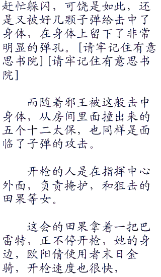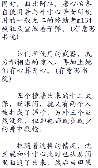 在邪王躲闪子弹的时候,房间里面不停的传出了惨叫声,只见这会不单是叶寸心使用着终结者m134在扫射着,沈兰妮也同样是如此。