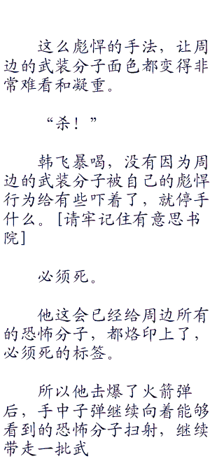 子弹的轰鸣声接连响起,杀意沸腾的韩飞在开启了杀戳模式了后,绝对是非常可怕的,他疯狂收割生命,子弹往往射击传出,都会带走好几个人的生命。而对于敌人的射击,他却是只需要身形一动,就躲开了攻击,让敌人完全不能锁定他的身形。
