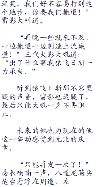 “退后!”对于易辰的作战风格早就知根知底的一众砂忍早在易辰创造出强袭自由高达的瞬间就不顾一切的向后退开。
