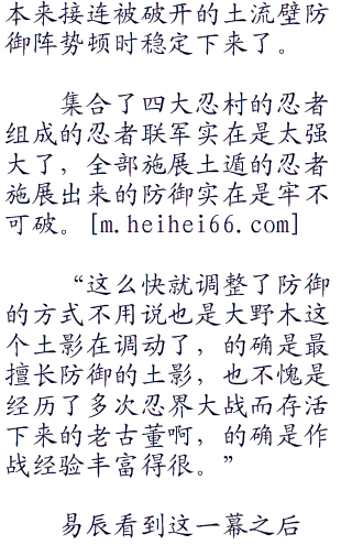 “土遁·土流城壁!”城墙一般的土流壁连接起来将忍者联军保护得密密实实。