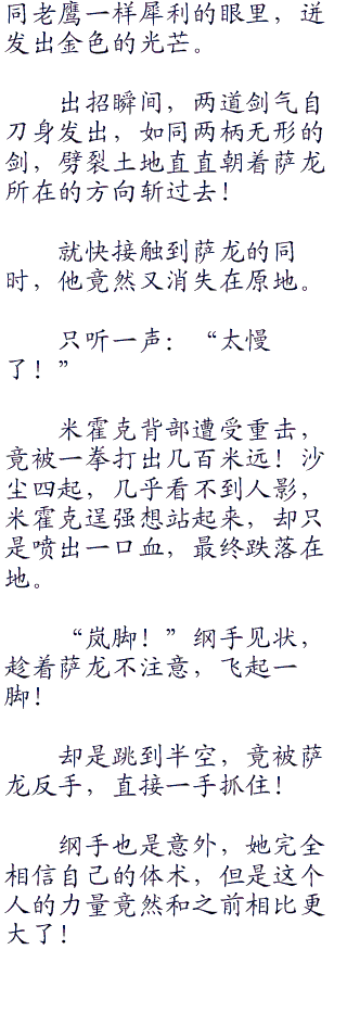 但是萨龙却并没有给她过多分心的时间,密集而相当有力量的拳头,不停对着她再把空中的身影砸过去,丝毫没有怜香惜玉的意味。