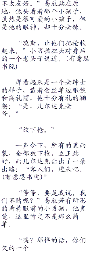 “你们要试一次么.?”竟然是一个小孩子的声音,易辰转头一看,一个金发碧眼,看起来粉nen可爱的小男孩,但是穿得实在难看,像暴发户一样。