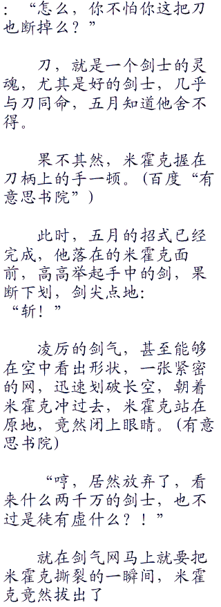 米霍克抬脚一踹,五月轻松后退挑起,软剑随之抽离,他却没有丝毫的困顿,跳到一棵树上,五月扶着树干看着米霍克:“你还是收手吧,你的刀迟早回断掉。”