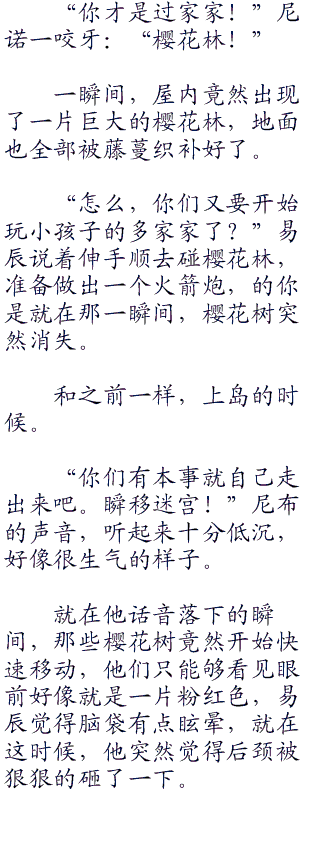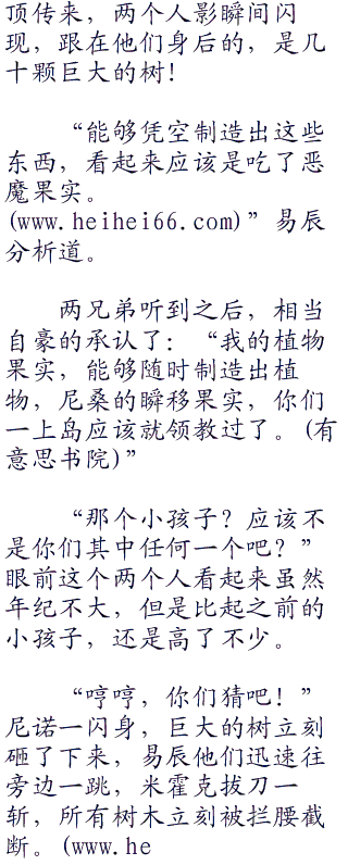 突然他的头顶上出现一棵巨大的食人花,食人花往下一张嘴,直接把黄衣服的头给吞了进去,绿衣服赶紧伸手一碰,那是食人花立刻消失了,然后绿衣服狠狠地拍了一下黄衣服的脑袋:“尼诺,你在做什么?!”