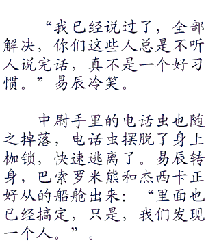 “哦。”杰西卡顺势用刀翘起船上面的人,一用力,就把他整个翻到海里去了,然而她正准备回去的时候,一把刀抵住了杰西卡的脖子。