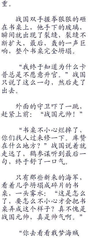 看着士兵走出去的时候脚一直在抖,鹤也是头痛的揉了揉太阳穴:“你知道就卡普那个性格,别说是你的命令,就是空总元帅亲自下令,他什么时候完全听过。”