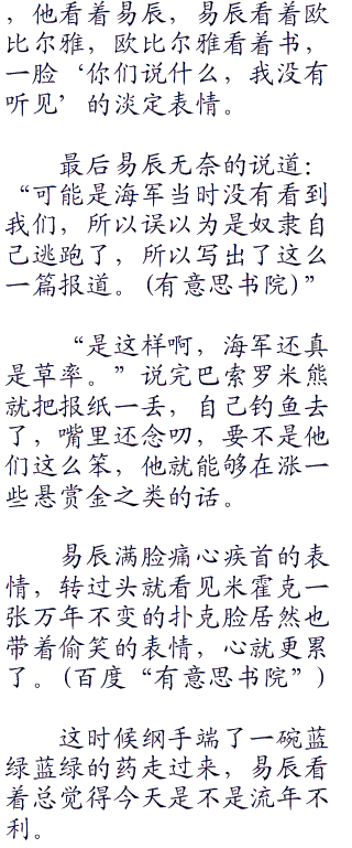 “什么吗,这群海军真是吝啬啊。”说着易辰转身躺回了躺椅上,巴索罗米熊在一边看得满脸黑线:“如果我没有记错,船长你现在躺的就是从海军那边抢过来的吧?”