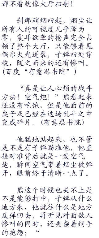 这仿佛是一个号令,大厅迅速涌入数十人,每个人手里都有热武器,他们似乎完全不在乎自己能不能打中,甚至不在乎是不是会伤到自己人,看