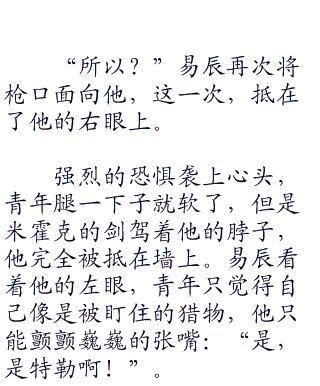 易辰眼神一冷,随便抓其身边的一个筷子,立刻变成了一把轻便的手枪,枪口正对青年的眉心,那青年眼神一慌,立刻躲开。