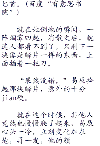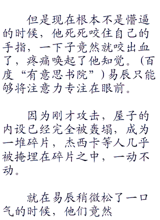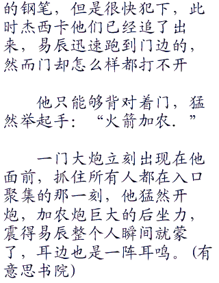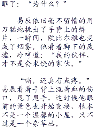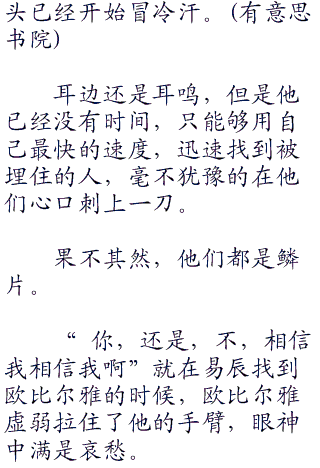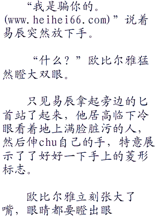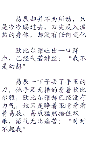 “易辰我不是幻象”欧比尔雅看着易辰仓皇离开的背影,撕心裂肺的喊出最后一句,枪声瞬间响起,只听见她惨叫之后,就再也没有动静。