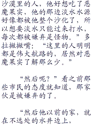 正准备回到旅馆的的时候,易辰一转身却看到了克洛克达尔。克洛克达尔站在沙漠的那一边,旁边的市民看到之后,竟然立刻尖叫的跑开了。
