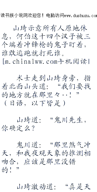 ;;;;也没有人敢过问,这看似有点像日本鬼子单独的秘密,不过大家都很清楚,这些日本鬼子残暴不仁,来到中国无恶不作,烧杀抢掠,几乎是无恶不作,现如今,他们这么平静,没有屠村,倒是给他们一种下意识的心里不安,怀疑这群心理变态的小鬼子在暗地里搞什么阴谋诡计。