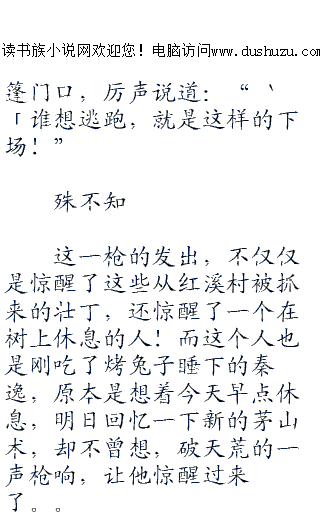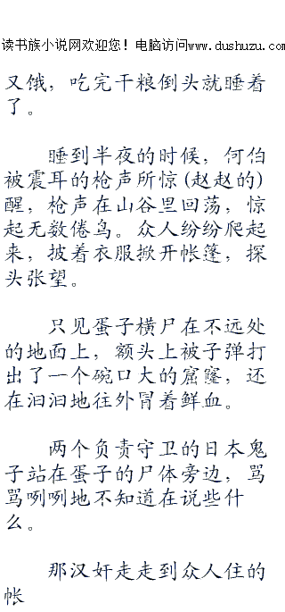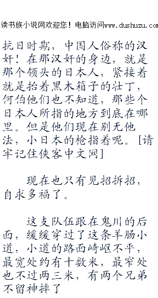 ;;;;啪!何伯的屁股挨了一脚,一个鬼子冲他大声嚷嚷,何伯虽然不知道他在骂什么,但他能够猜到,这个鬼子是在骂他少废话,快点赶路。何伯在心里把这鬼子的全家老少全问候了一遍。