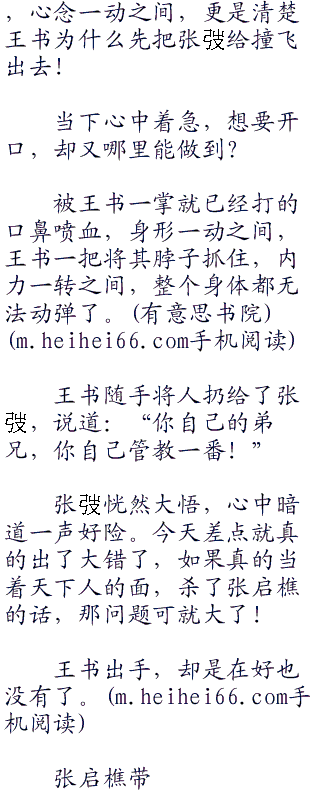 王书伸手插在了两人之间,肩膀一撞,就把张弢给撞飞了出去,反手一掌打向了张启樵,张启樵知道王书的厉害