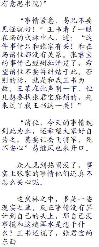 “张家是张家,张君宝是张君宝。”王书淡淡的道:“你这话说出来之后,意思就好像张君宝得到的东西就是你的一样。纵然是张弢大侠也不会说这种话的。”
