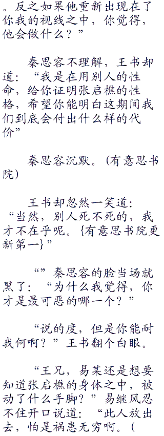 “思容”张启樵叹了口气道:“罢了罢了,何必呢?思容,你不用为我求情。说到底,是我自作自受。”