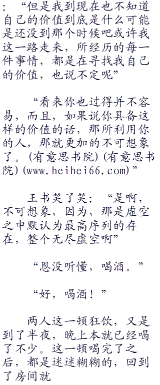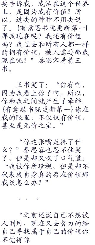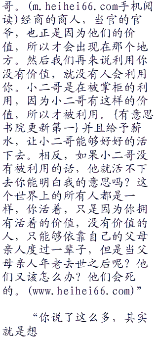 “你知道什么是被人利用吗”王书笑了笑道:“这么说吧,我们活在这个世界上,都是存在着价值的。如果没有价值的人,就和街边的乞丐没有什么区别。他们存在的价值,只有别人给点残羹剩饭之类的东西,这么简单而已”