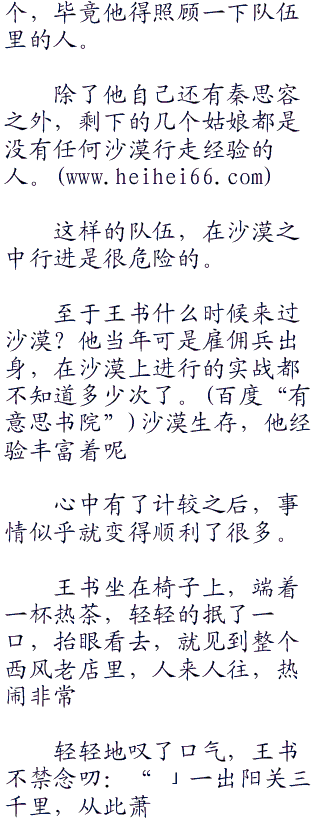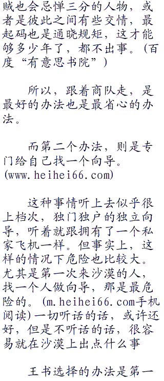 再这样的地方,最简单的办法,就是找到一个商队,然后和商队的人合流,跟着他们走。他们都会有专业的向导,或者是走了多年的老人。这样的人,在沙漠之上摸爬滚打了这么多年,对沙漠的熟悉仅次于自己的老婆。而且,他们人多势众,就算是真出了点什么事,也可以解决的了,最重要的是,他们门路清,能够在这条路上驰骋多年的,多是马