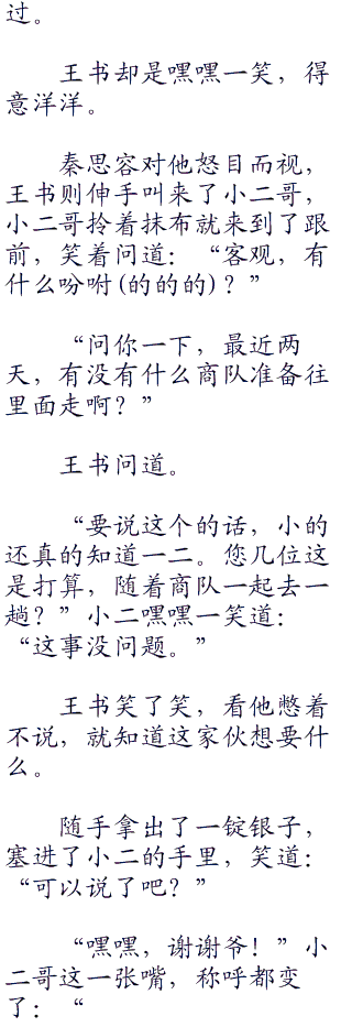 王书等人在旁边找了一个西风老店,进去要了几间上房,然后叫了吃食上来,大吃了一顿,大家也就休息下来了。