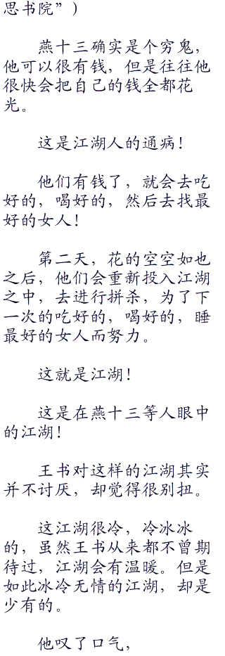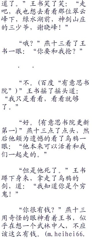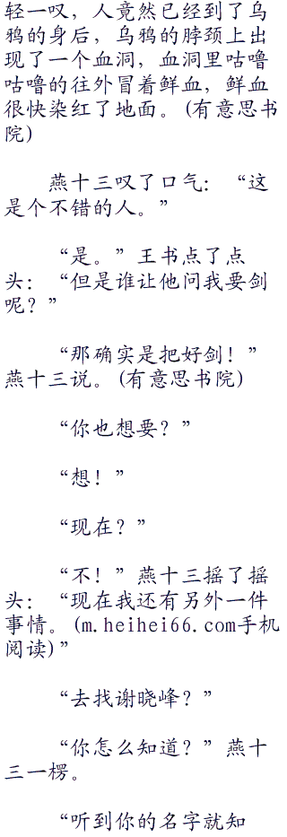 燕十三笑了,他笑的前仰后合,似乎这辈子第一次听到这么开心的笑话。他为什么笑的这么激烈,王书不知道,乌鸦也不知道。但是为什么要知道?身在江湖,人在江湖,手中杀了多少人,有多少人是无辜死在自己手上的,谁又知道?再这样的江湖之中,做什么事,想什么事,又有什么目的,又有多少人会知道?