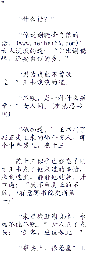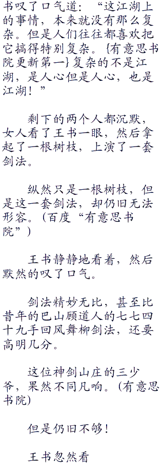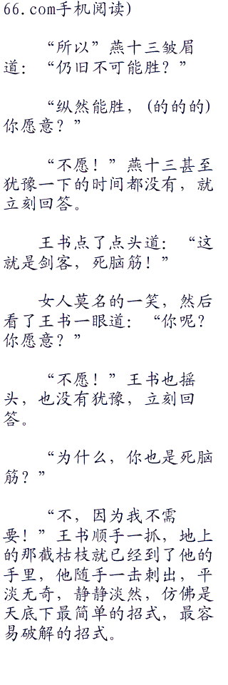 “比你想象之中的还要多!”王书道:“包括你从来都不希望,他真正的死于别人的手中。所以,你明明知道,那剑法之中的所谓破绽,根本就是一个陷阱,却仍旧会教给燕十三!因为你很清楚,你杀不了谢晓峰,这个天底下,能够杀死谢晓峰的人,只有谢晓峰自己!或许还得加上我!”