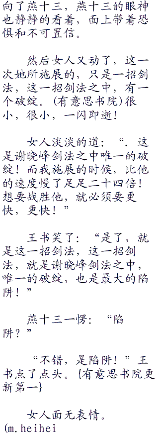 “当然知道!”王书道:“谢晓峰骗了你,却又和你生了一个孩子,你知道他剑法之中的所有精妙之处,但是你却不是他的对手。所以,你想找燕十三,帮你杀了他!”