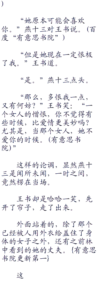 女人已经不在了,她不知道什么时候就走了,现在这里就剩下了王书和燕十三。