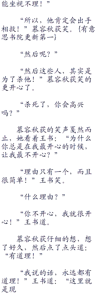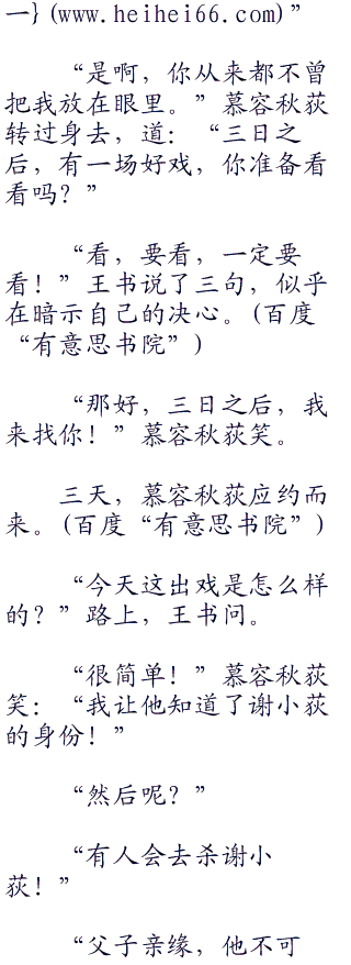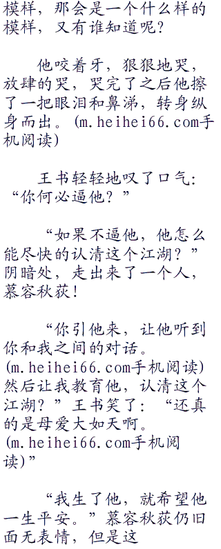 “人啊”王书叹了口气道:“一旦在江湖,就永远都在江湖。走?走得出人心?走不出人心,就永远都在江湖之中。你爹是这样,你母亲也是这样。你爹深恨自己杀人太多,所以憎恨自己,想要忘掉一切,不管是曾经的荣誉,还是别的什么,他都想忘掉,都想放弃!但是他无法放弃!纵然他成了最没用的阿吉,剑神谢晓峰,成了一个馒头蘸了大粪,却仍旧能够剥皮吃掉的没用的阿吉。但是他仍旧走不出这江湖,走不出人心险恶!我们又能够去哪里?只要人在江湖,学了一身武艺,你总会忍不住去用!只要人心险恶,总有人要去欺负你,打压你,然后呢?你不反抗?你有一身武功,为什么不反抗?你不反抗你的朋友,亲人,就会被这些人欺负,打死,这样的结局,也是你想要的?”