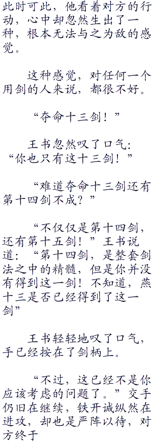 王书忽然话题一转道:“听说你会燕十三的夺命十三剑!”