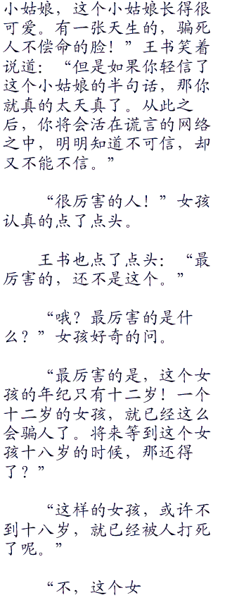 这真的还是一个女孩,一个很小很小的女孩,大概只有十一二岁的年纪,稚嫩的脸上,一双大大的眼睛,流露着陌生和恐惧的表情。她看着王书,仿佛是在看着某种危险。但是回头,看着挂着雨珠的庙门,却又觉得那更加危险,仿佛是怪兽的大嘴!