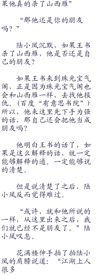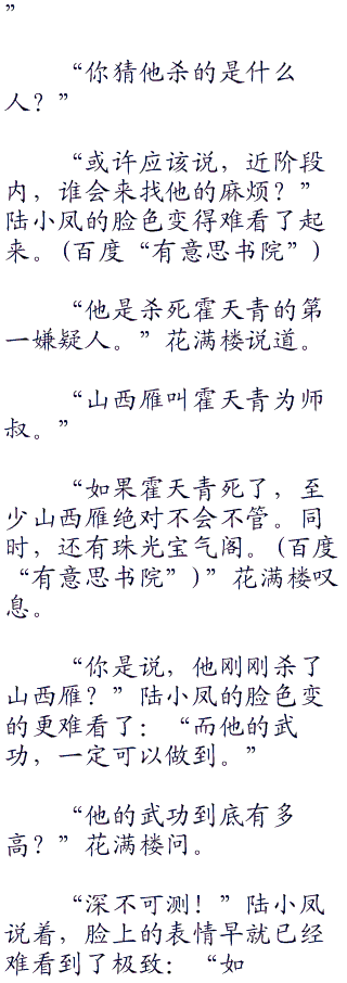 “但是宴会已经成为了泡影,因为霍天青死了。”陆小凤叹息:“你知道是谁杀的霍天青?”
