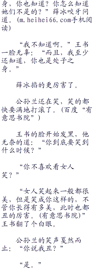 王书无奈的看着薛冰,薛冰问:“你怎么知道她们还是还是处子之身?”
